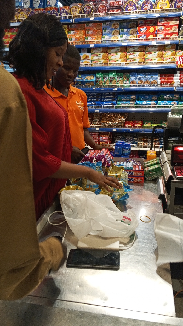At a supermarket checkout counter in Tarauni, Nigeria, three individuals are present