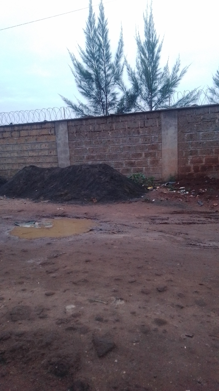 The image depicts an unpaved outdoor scene in Nkaimurunya ward, Kenya, under an overcast sky. In the background, a light-colored brick wall with intermittent concrete pillars is topped with coiled razor wire. Several tall, slender evergreen trees with needle-like leaves are visible rising above and behind the wall. In the middle ground, directly in front of the wall, rests a substantial dark brown or black mound of earth or aggregate. To the left of this mound, an irregularly shaped puddle of light brown water occupies a depression in the reddish-brown, compacted dirt ground. Scattered debris and sparse vegetation are visible on the ground near the wall, particularly to the right of the soil mound. No individuals, animals, or active interactions are present in the frame.