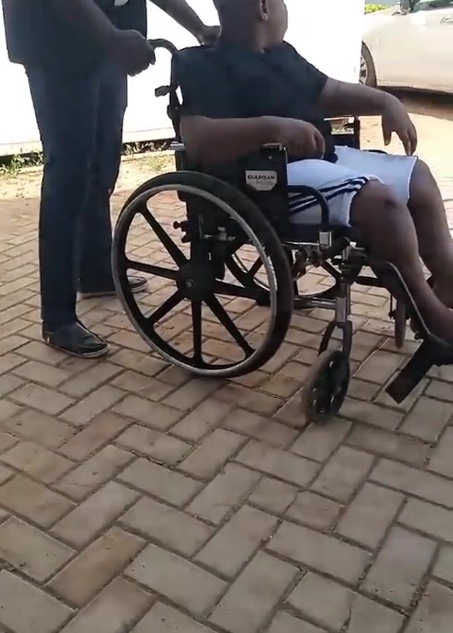 A person pushes a young person in a wheelchair on a bricked surface. The person pushing wears black slacks, a black vest, and black shoes. The person in the wheelchair wears a black shirt and white shorts. The wheelchair has black wheels and is labeled “GUARDIAN.” A white car and a white wall are visible in the background.