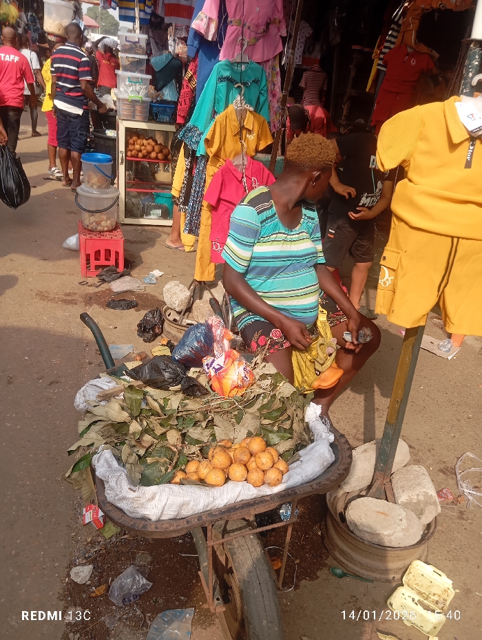 A street market scene showcases a woman sitting near a wheelbarrow filled with leaves and orange fruits. Clothing is displayed on hangers nearby, with customers browsing. Other goods are visible in a display case and stacked on a red crate. The ground is littered with trash, and a weathered metal structure supports stones. The date "14/01/2026" is visible in the bottom right corner.