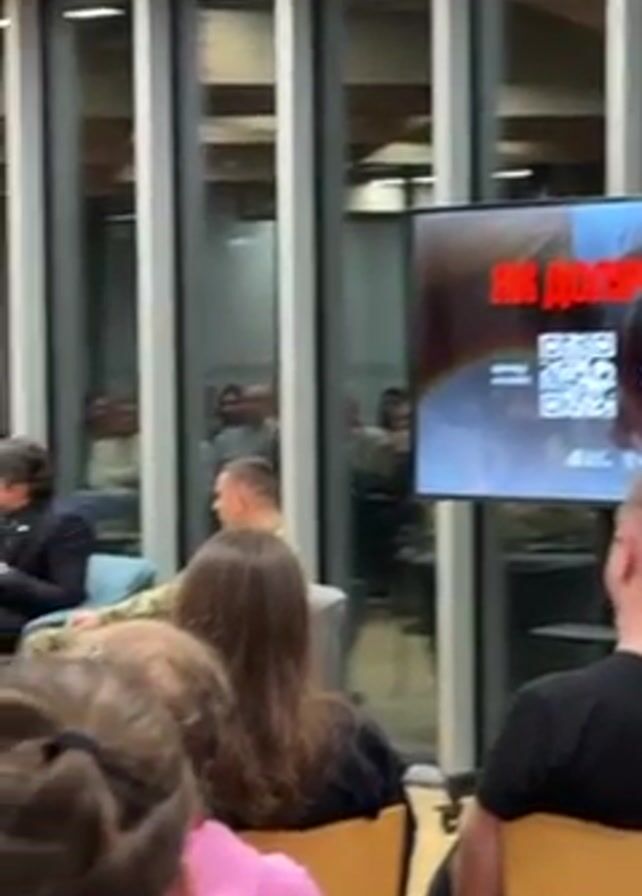 panel discussion taking place indoors. In the foreground, an audience is seated, listening. The focus is on three panelists: a woman in a navy blazer and light pants, a man in a dark blazer with a gray shirt, and another person partly visible, wearing a military uniform. The man in the blazer speaks into a microphone. The panel sits in chairs, with a small table between the woman and the man in the blazer, holding glasses of water. Behind the panel, a large screen displays the words "ЯК ДОЛУЧИТИСЯ" in red, accompanied by two QR codes and logos at the bottom. The room has a modern design, featuring tall glass windows with vertical white frames, reflecting the interior and exterior. The lighting is bright, contributing to a clear view of the scene. People are visible standing and moving behind the glass.