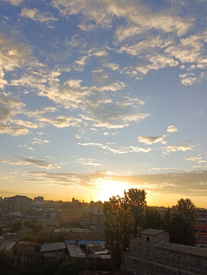 A cityscape view at sunrise or sunset. The sun casts a golden glow across buildings and silhouetted trees. The sky is filled with scattered, puffy clouds tinged with yellow and white against a blue background. The scene captures a blend of urban structures and natural elements under a bright, dramatic sky. Rooftops and buildings fade into the background as the sun illuminates the horizon.