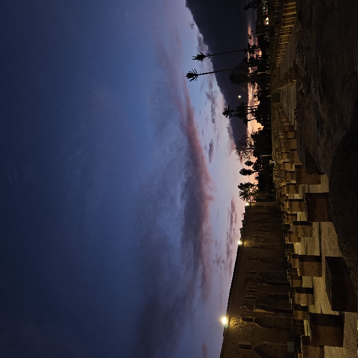 A sideways view reveals a dramatic twilight sky of deep blues and purples, streaked with pink hues from the setting sun. Palm trees silhouette against the colorful horizon. Ancient stonework, illuminated by soft lighting, lines the bottom of the frame, featuring rows of cuboid structures and textured walls, hinting at an archaeological site or historical landmark.