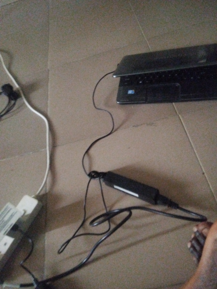 The scene depicts an indoor setting in Kaninkon, Nigeria, with electronic equipment laid out on a tiled floor. A dark grey laptop, partially open with its screen facing away, is positioned in the upper right section. A black power cable connects the laptop to a black power adapter, which features a white label and rests centrally on the light-colored tiled floor. This adapter is further connected by a black cable to a white power strip, partially visible in the mid-left. A white cable, likely an extension cord, extends from the power strip. A bare, dark-skinned human foot is partially visible in the lower right corner, positioned near the laptop's power adapter.