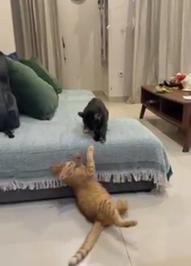 two cats, an orange tabby and a dark tortoiseshell, on and near a couch covered with a light blue and white checkered blanket. The orange cat is on the floor, reaching up towards the dark cat which is on the couch. The dark cat begins licking its paw. The couch has several green pillows on it and a black backpack rests on one side. In the background, there are neutral-colored curtains, a clock on the wall, and a wooden side table with items on it. The floor is light-colored tile. A woman's voice is heard briefly.