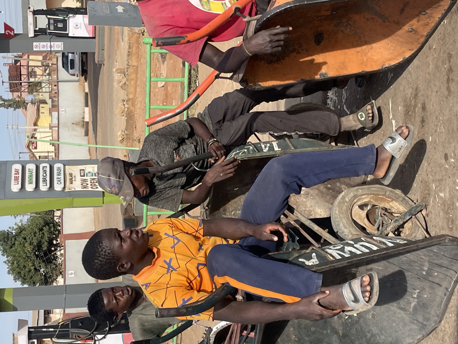 Four young males are depicted gathered at a fuel station in Jos, Nigeria, under a clear sky. In the foreground, a male of African descent, wearing an orange short-sleeved shirt with black patterns, dark blue track pants with an orange stripe, and grey Nike slides, sits on a dark-colored, single-wheeled pushcart. He is looking towards his right, with a slight open-mouthed expression. To his right, a second male, also of African descent, wearing a grey patterned short-sleeved shirt, dark trousers, a multi-colored baseball cap, and dark slides, sits on a similar dark pushcart, holding a dark metal rod. He is looking towards the first male. Partially visible on the far right is a third male in a red short-sleeved shirt, with a yellow bracelet on his right wrist, seated on an orange-colored pushcart. A fourth male is partially visible on the far left, in a dark shirt, observing the scene. The immediate ground is dirt and gravel, transitioning to asphalt further back. In the background, green and grey structures of a fuel station are visible, including a sign advertising "LUBE BAY," "MINIMART," "LUBRICANTS," and "CAR WASH," with "NOW OPEN" at the bottom. A fuel pump marked "2" is present. Distant residential buildings and a light-colored sedan are visible behind the fuel station structures. Green metal railings delineate parts of the area.