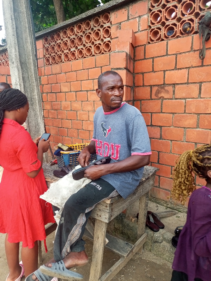This image depicts an outdoor scene in Ado, Nigeria. A dark-skinned adult male, presumed to be a shoemaker, sits on a crude wooden stool in the central foreground. He wears a grey short-sleeved t-shirt with a red collar and "HOU" text featuring a bull logo, along with dark track pants. He is barefoot, holding a dark brown sandal in his hands as if performing a repair or inspection. To his left, a dark-skinned adult female with braided hair stands, wearing a red short-sleeved dress and pink flip-flops; she is focused on a black smartphone held in both hands. On the far right, the back of a child's head with blonde braided hair and a purple garment is partially visible. The background consists of a reddish-brown brick wall topped with a horizontal band of decorative terracotta ventilation blocks arranged in a circular pattern. A blue and yellow woven basket containing tools or materials is on the ground behind the male, next to several other dark brown shoes. A pair of grey Adidas-style slides is visible near the female's feet. The ground beneath the subjects appears to be unpaved earth, and green foliage is discernible above the wall line.