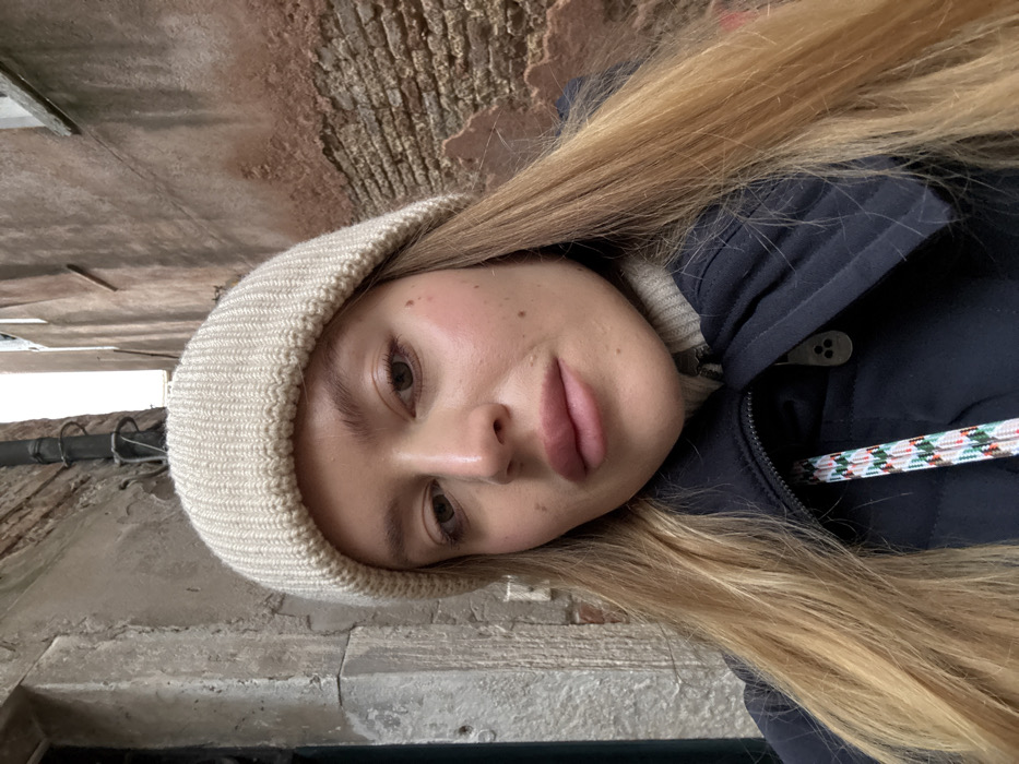 A female subject, appearing to be in a narrow alleyway (calle) characteristic of Venice, Italy, is captured in a close-up, front-facing image. She wears a cream-colored ribbed knit beanie, a light-toned turtleneck, and a dark blue or black puffer jacket, over which a colorful, patterned strap is visible. Her long blonde hair is parted centrally and frames her face, which displays light brown eyes, a neutral expression, and lightly made-up lips. The background consists of tall, aged building walls; the left wall appears to be grey stone, while the right wall is reddish-brown brick with visible sections of degraded plaster. A dark pipe runs vertically along the right wall. A narrow strip of bright sky is visible between the structures at the top of the frame.