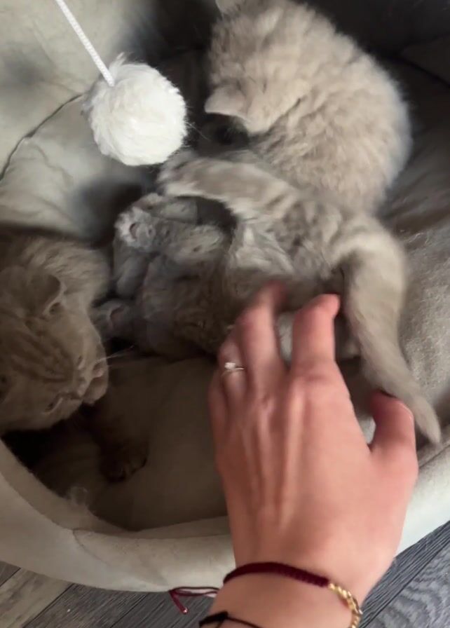 The scene features a person interacting with three small kittens nestled in a pet bed. The kittens have light gray fur. The bed is beige and rounded, with a white fluffy toy hanging inside. The person's hand, adorned with red nail polish and bracelets, reaches into the bed to gently touch the kittens. The floor underneath the bed appears to be made of light-colored wood.