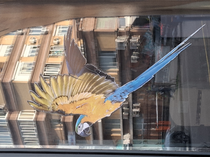 - "The image depicts a large, adhesive decal of a Blue-and-yellow Macaw in flight, attached to the exterior surface of a transparent glass window" by FM-lcZol2, licensed under CC BY 4.0