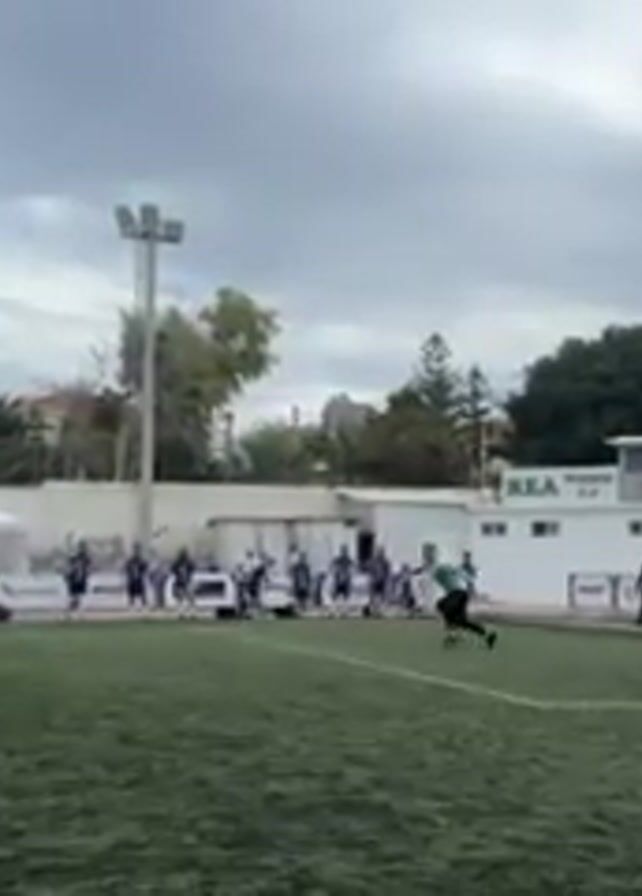 soccer game being played on a green field. One player in a gold uniform kicks the soccer ball towards the goal while a goalkeeper in a green uniform attempts to block the kick. The ball goes past the goalkeeper into the goal. An official in an orange uniform stands near the goal line. In the background, spectators can be seen standing behind tents and along the sidelines. The sky is cloudy and overcast. A sign with the words "REA Women F.C." is visible on a building in the background.