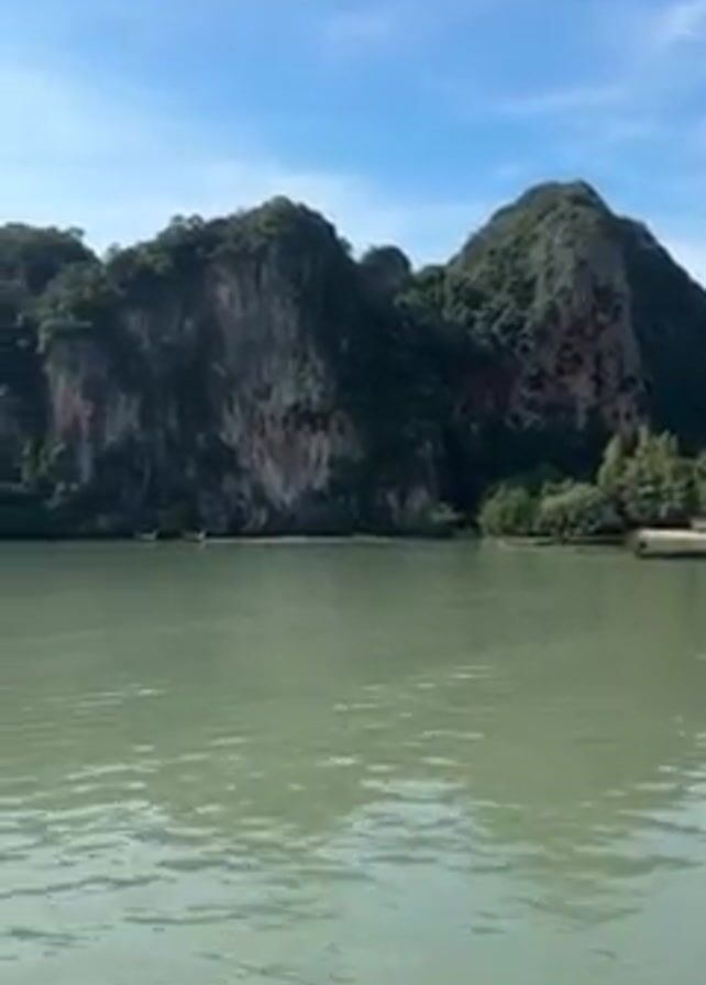 view from a boat on a body of water. In the distance, there is a large, rocky island covered in green vegetation. The sky is blue with some clouds. There are some small boats along the shoreline of the island. The water is a greenish-grey color. The camera appears to be moving slightly.