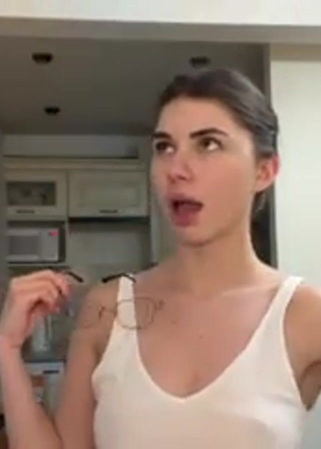A young woman with dark hair in a bun and wearing a white tank top puts on glasses. The room is bright, and you can see part of a kitchen through an open doorway. There’s also a clock on the wall, a painting, and other furniture. Upbeat music plays in the background.
