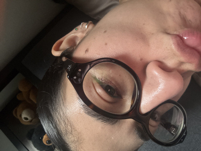 A close-up of a face with glasses. The person is lying down. The frames are brown and round. The person's hair is dark and slicked back. Ear piercings are visible. The person's lips appear plump. There are teddy bears visible in the background. The skin is slightly shiny. The eye visible through the glasses shows green eyeshadow.