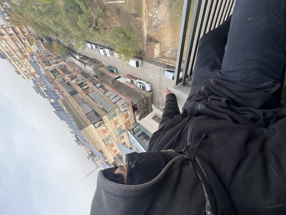 The image captures an elevated, tilted view of an urban residential area within Al-Midan Municipality, Syria, under an overcast sky. In the immediate foreground, a person is visible from the chest upwards, dressed in a dark hooded sweatshirt with the hood up and a black balaclava or face mask covering the lower face. Their right arm is extended, resting on a concrete barrier or ledge, indicating they are positioned at a significant height, possibly on a balcony or rooftop. A dark metal railing is visible below this concrete structure. Across a narrow, paved street, a dense array of multi-story residential buildings forms the background. These buildings exhibit various facades, numerous windows, and external air conditioning units. A prominent feature is the extensive installation of solar panels across the rooftops and balconies of nearly every building. Parked vehicles line the street, including a white van, a white SUV, a red sedan, and a green car. To the right of the street and buildings, an undeveloped area with trees, foliage, and exposed earth is visible, along with a small, light-colored structure featuring a reddish roof. The sky is uniformly light grey and cloudy.