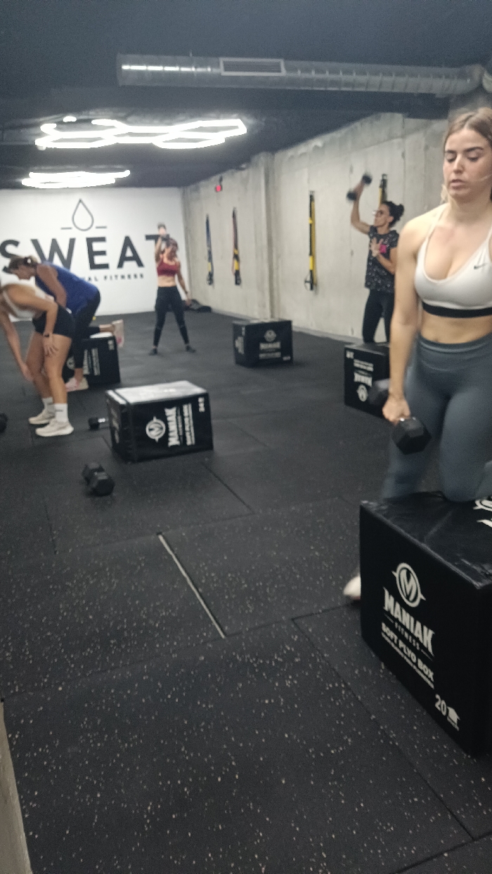 The image depicts an indoor fitness studio, identified as Sweat Glocal Fitness, located in Sagunto, Spain