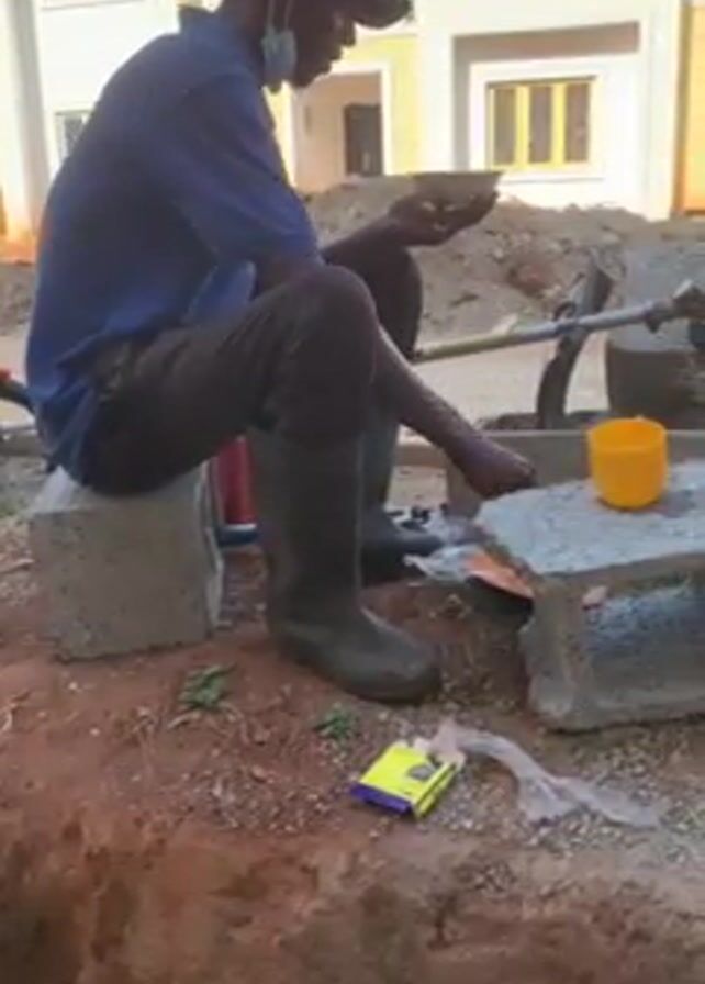 A man wearing a blue polo shirt, dark trousers, black boots, and a dark baseball cap sits on a concrete block. He also wears a face mask. The man eats from a small bowl. To his right is a concrete block structure supporting a yellow cup. A box of matches and plastic trash are on the ground next to the concrete blocks. A yard brush is leaning against one of the blocks. Behind the man is a building with white walls and multiple windows. The area around him is an unfinished construction site.