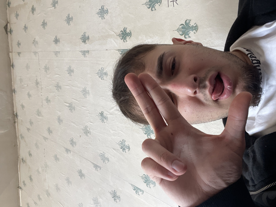 The image presents a close-up, head-and-shoulders portrait of a single young adult male positioned centrally. The individual has short, dark hair styled with a fringe and a faded cut on the sides, along with a short, dark beard. His right eye is partially closed, and his mouth is open with the tongue slightly extended. The left hand is raised in front of his face, forming an 'L' shape with the extended index and middle fingers and the extended thumb, partially obscuring the right side of his face. He is wearing a white t-shirt with a visible black collar that bears white text, including the discernible word "ANGELS." A black zippered garment is visible on the left side of the frame, worn over the t-shirt. The background consists of an interior wall covered with a light-colored wallpaper featuring a repeating pattern of light blue fleur-de-lis motifs. The wallpaper shows signs of wear, including visible seams, minor wrinkles, and some discoloration. Faint Cyrillic text is discernable on the wallpaper, which includes the phrase "гр. Пловдив," indicating the scene is located within the city of Plovdiv, Bulgaria.