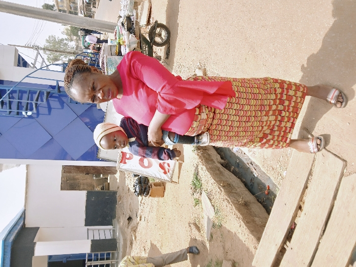 The image depicts an adult female holding a toddler on an unpaved street in Masvingo, Zimbabwe