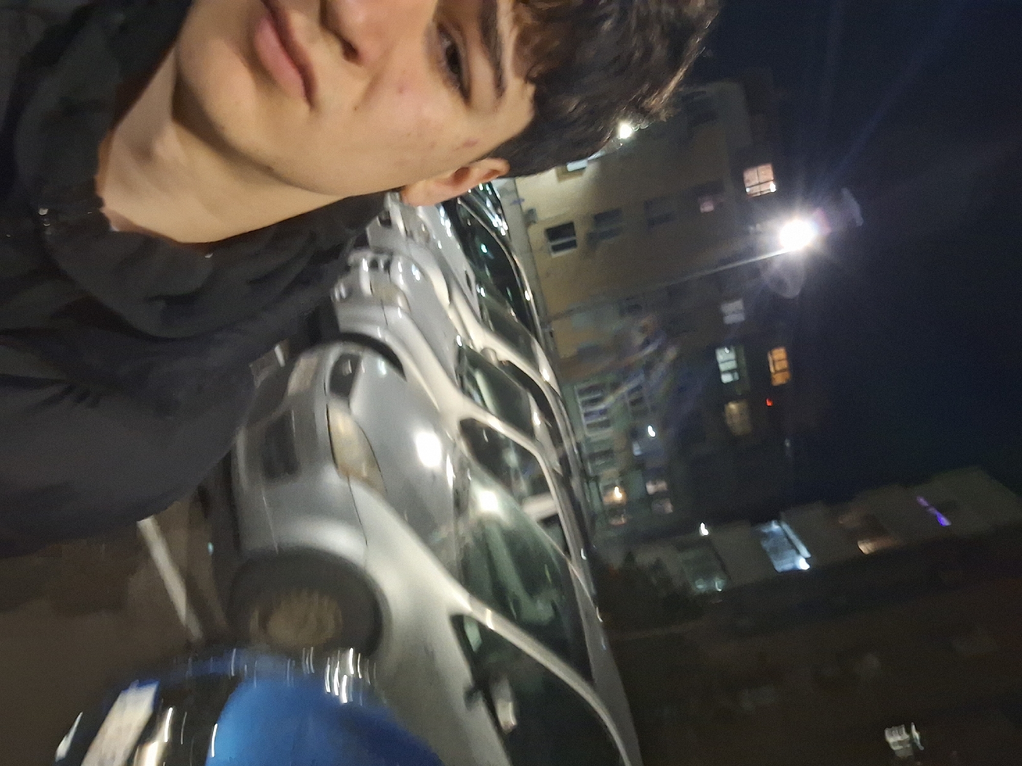 selfie taken at night. A person's face is visible in the upper left corner of the frame, with a dark jacket visible around the shoulder. Behind the person, there is a row of parked cars, mainly silver. In the background, there is a multi-story building with lit windows, illuminated by a street light. The location is likely in a parking area or street adjacent to a building. Considering the presence of Bulgarian language in the prompt and the fact that Burgas is in Bulgaria, I presume the photo was taken in the city of Burgas. The scene is poorly lit with unclear details due to the low light conditions.