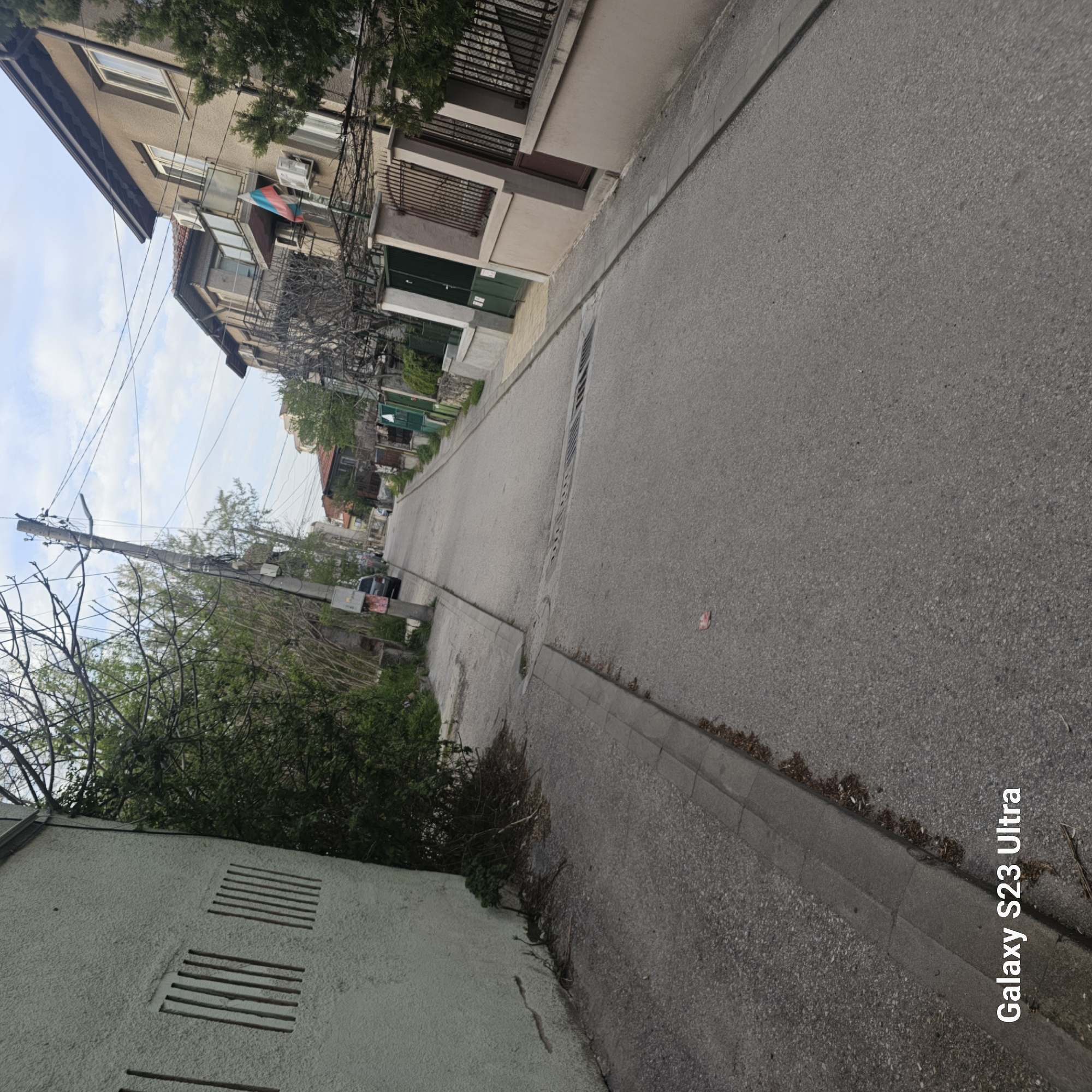 The image depicts a narrow, asphalt street in Haskovo, Bulgaria, lined with buildings of varying heights and architectural styles. The street runs downhill, suggesting a slope. On the left side, a pale-colored building with horizontal ventilation slots is visible in the foreground. Further up the street, buildings exhibit a mix of residential and commercial characteristics. Utility poles and wires crisscross the sky, adding to the urban feel. A vehicle is parked further up the street. The right side of the street features a concrete curb and accumulated debris. The perspective suggests the photo was taken from a low angle. The watermark "Galaxy S23 Ultra" is present in the bottom right corner.