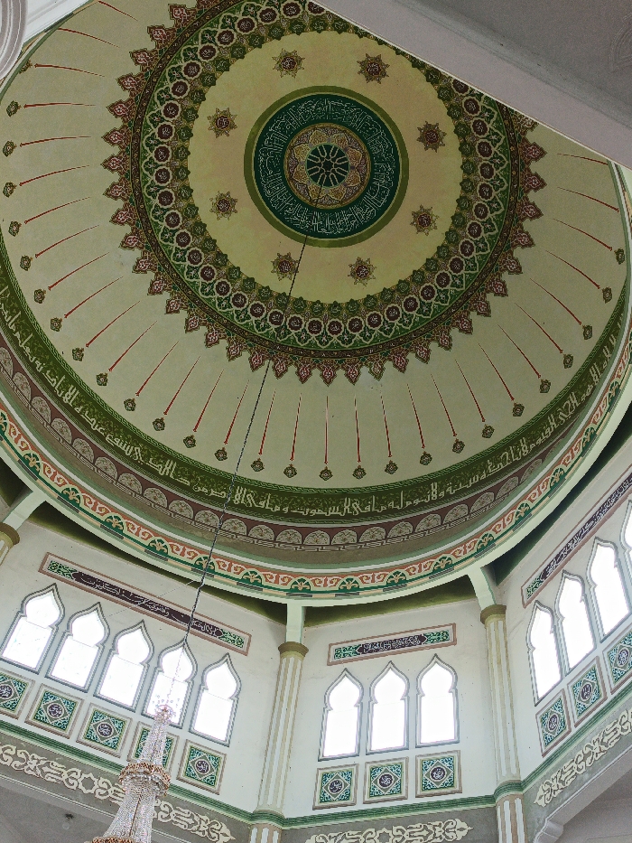 - "interior of a building, possibly a mosque, featuring a large dome intricately decorated with concentric circles of patterns and Arabic calligraphy" by FM-UeA623, licensed under CC BY 4.0