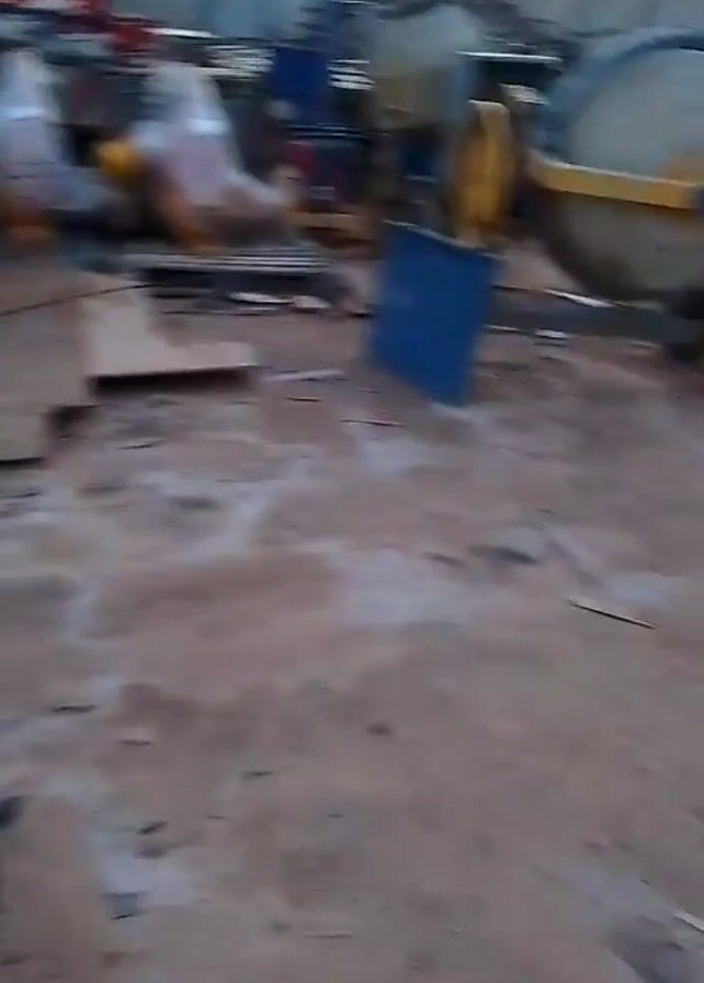 n outdoor industrial site, likely a construction or storage area. The ground is a mix of dirt and debris. In the background, there are stacks of materials covered in tarps and what appears to be red containers. A cement mixer, painted yellow and blue, is visible. The camera moves quickly, making it difficult to discern specific details. The video is somewhat blurry and has a low resolution. The watermark "itel P40" is present in the corner of the screen.