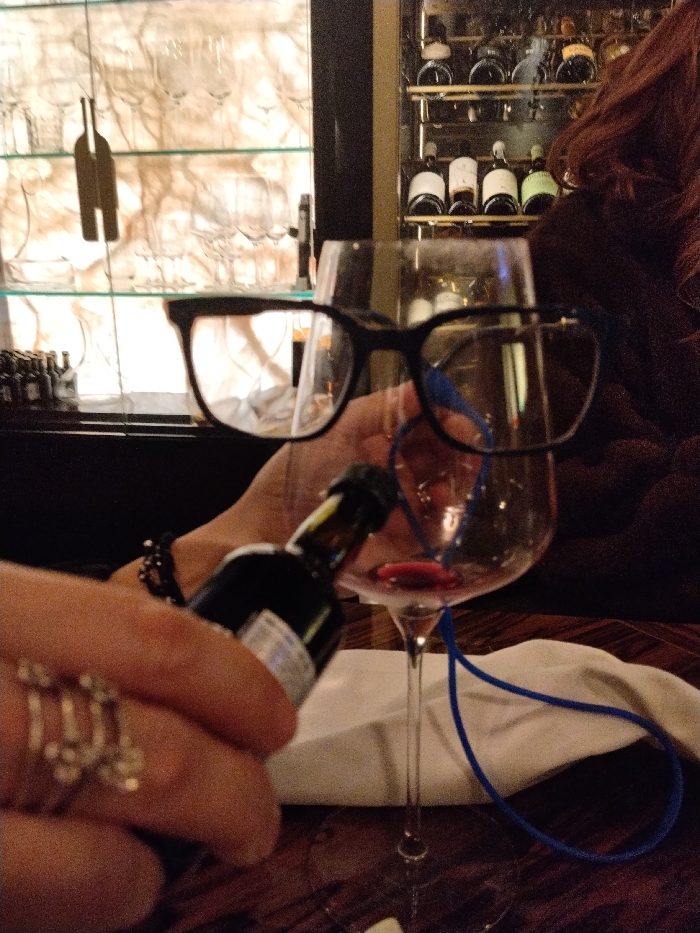 A person pours a small bottle of dark liquid into a wine glass already containing a small amount of red wine. Black-framed glasses are perched on the rim of the glass. A blue cord is wrapped around the glass's stem and base. A woman's shoulder is partially visible in the background. A wine cabinet and decorative wine-themed art are displayed behind the subject. The person wears decorative rings and a bracelet.