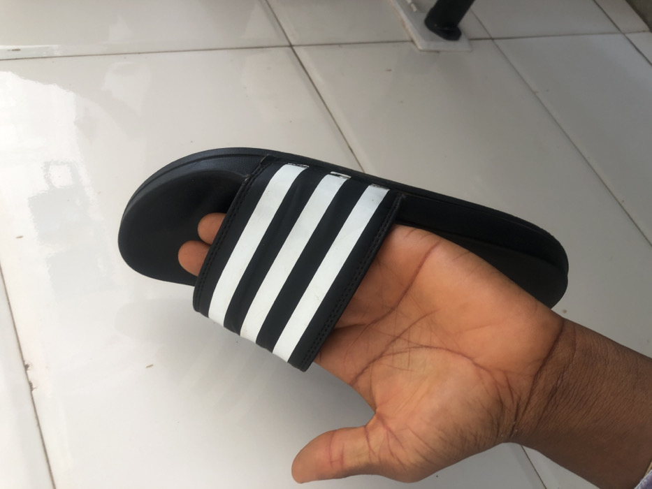 A dark-skinned hand holds a black Adidas slide with white stripes