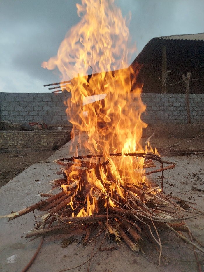 A bonfire burns brightly, fueled by sticks and branches, the flames reaching high into the dusky sky. A low brick wall and a simple structure with a corrugated roof form the backdrop. The fire sits on a concrete surface surrounded by dirt and scattered debris. The scene evokes a sense of warmth and rural simplicity.