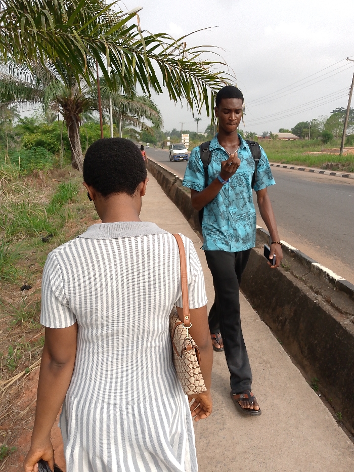 This image depicts a daytime street scene in Egbagu, Nigeria. Two individuals are present on a concrete sidewalk adjacent to an asphalt road. In the foreground, an adult female is seen from the back, walking forward. She has short, dark hair and wears a white and grey vertically striped short-sleeved collared dress. A patterned brown shoulder bag hangs from her right shoulder, and she holds a dark object in her left hand. To her right and slightly ahead, an adult male walks towards the viewer's left. He wears a blue patterned short-sleeved shirt, dark trousers, and dark sandals, and carries a black backpack. He holds a small, light-colored object near his chin with his right hand and a black smartphone in his left hand, looking downwards. The environment includes a concrete drainage culvert separating the sidewalk from the road. The road exhibits white edge markings, and a white van is visible in the distant background. Numerous palm trees and dense green vegetation line the left side of the sidewalk and extend into the background. Utility poles are visible along the road in the distance. The sky is overcast.