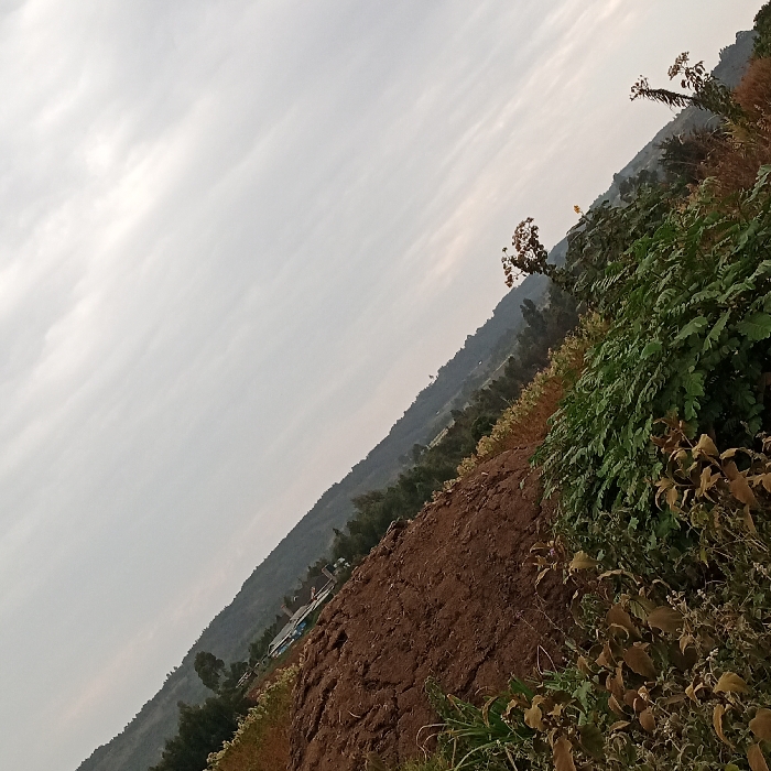 The image depicts a sloping landscape under a cloudy sky. The foreground features dry, cracked earth and dense vegetation, including shrubs and ferns. In the midground, a hillside covered with trees and greenery stretches towards the horizon. The sky is overcast with a uniform layer of clouds. The overall scene appears to be a rural or agricultural setting with a focus on natural elements.