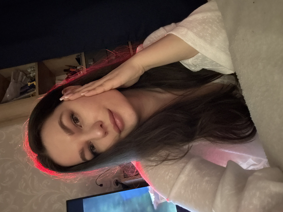 A brunette woman with fair skin lies with her head tilted on a pillow. She wears a white, short-sleeved shirt. Her left hand rests on her face. The background is dimly lit with shelves visible and a dark headboard. A television screen can be seen at the bottom edge of the frame, along with electrical outlets and cords. The lighting has a slight red tint.