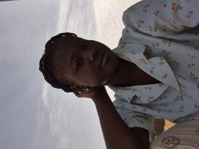 An outdoor, eye-level portrait-style image captures a young individual, likely female, with dark skin, positioned against an overcast sky