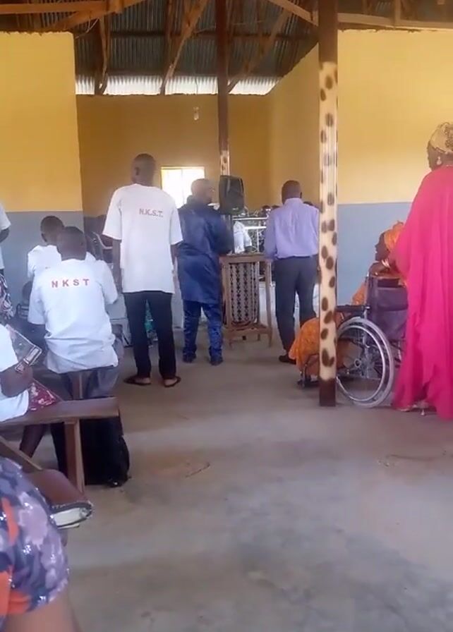 The scene is indoors, likely a community hall or church, with a high, exposed timber roof structure and cream-colored walls. Several people are present. Three individuals wearing white shirts with the inscription "NKST" are standing or sitting to the left. At the center, a man in a blue outfit is tending to a lectern. Another man in a light purple shirt and dark trousers is standing to the right of the lectern. Further to the right, a woman wearing a pink garment is standing near a person seated in a wheelchair with a leopard print throw. People are scattered around the room, and the overall atmosphere appears to be casual, possibly before or after an event. The floor is a simple concrete surface. The camera is handheld, adding a slight shakiness to the video.