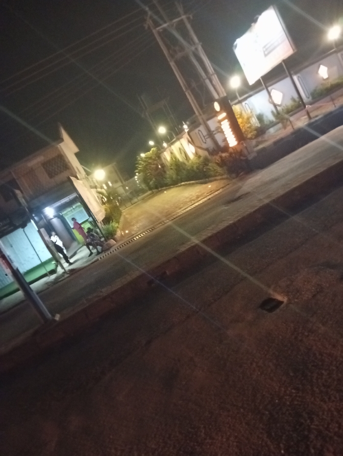 Nighttime street view. A street light illuminates buildings and signage, with a person standing near a shop. Power lines stretch overhead, contrasting with the dark sky. The street shows a grid pattern. A billboard stands tall amidst the ambient lighting. The road occupies the foreground, its surface dark and textured.