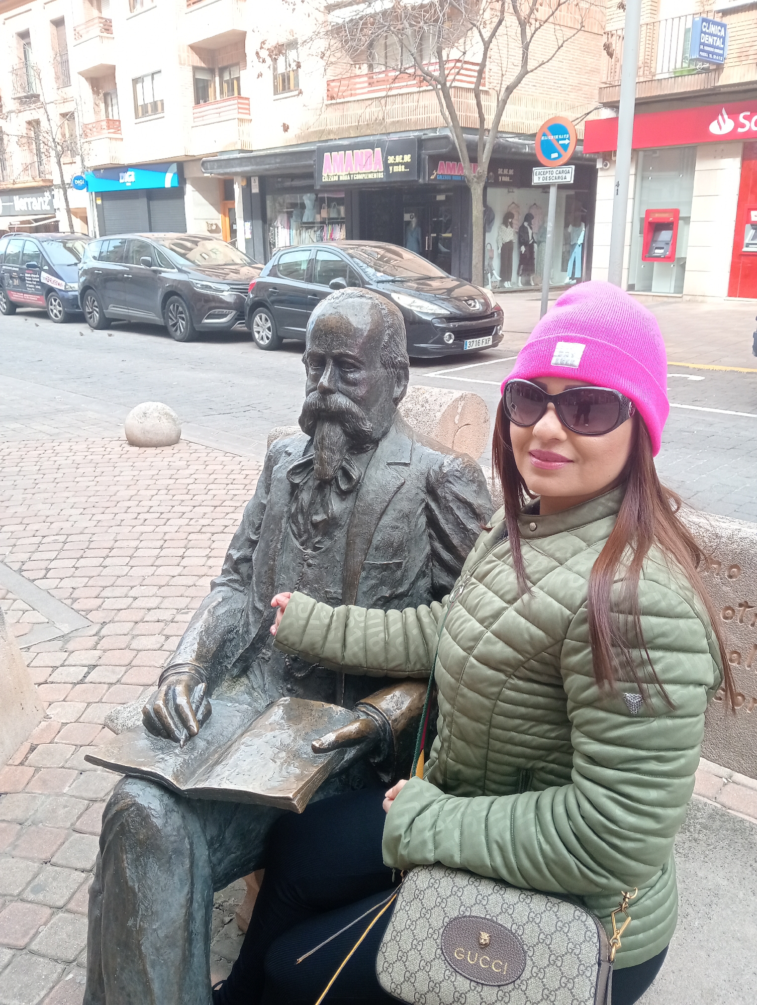 The image depicts a woman posing next to a bronze statue in the city of Segovia, Spain. The woman, with long brown hair and sunglasses, wears a pink beanie and a green quilted jacket and sits beside the statue with her hand resting on the statue's arm. She also has a Gucci purse on her lap. The statue is of a man with a beard, dressed in a suit and seated with a book open in his lap. Behind them is a paved public space and a street with parked cars. In the background, storefronts with signs are visible, including "AMANDA" and "Clínica Dental" and "Santander". A blue and white no-parking sign is visible. The license plate of a parked car is visible, reading "3716 FXP".