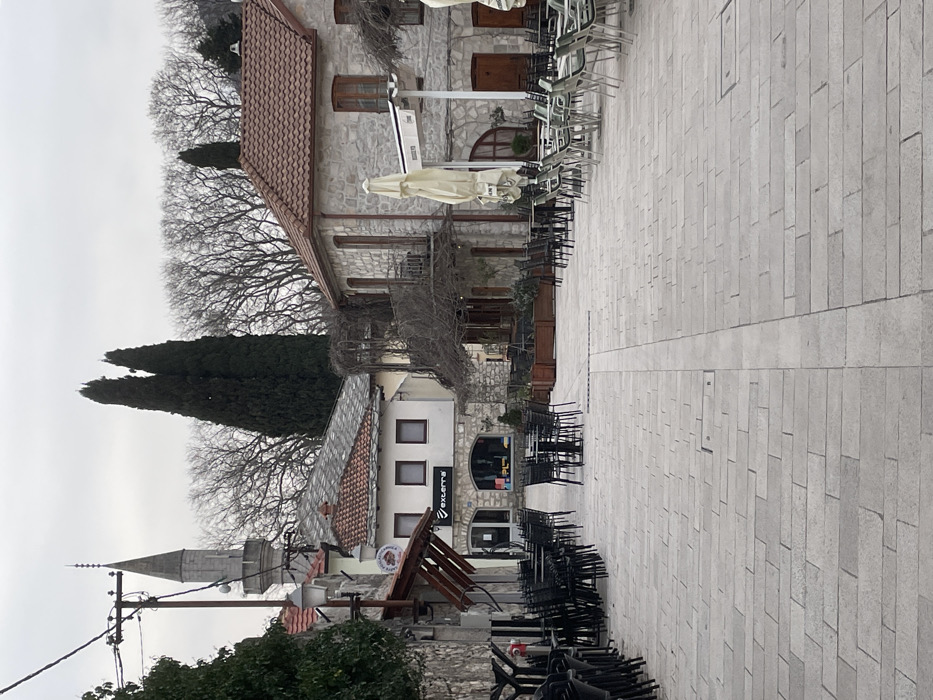 - "The image depicts a deserted outdoor pedestrian plaza within the city of Trebinje, Bosnia and Herzegovina, viewed under an overcast sky" by FM-srcYD2, licensed under CC BY 4.0