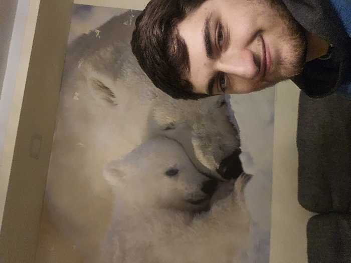 An indoor scene features a young adult male in a close-up, smiling towards the camera. The male, positioned on the right side of the frame, has dark hair and a light beard, and is wearing a blue and gray hooded top. The background is dominated by a large wall hanging, depicting a mother polar bear and a cub resting together in a snowy environment. Above the wall hanging, a section of a light-colored wall with a rectangular recessed light fixture is visible. Below the wall hanging and to the left of the male, a dark gray sofa or couch is partially visible. The image provides no specific details to determine a precise location within the city of Tbilisi, Georgia.