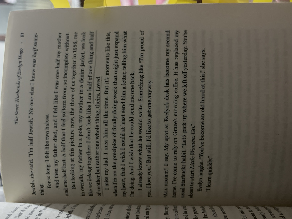 An open paperback book, identified as 'The Seven Husbands of Evelyn Hugo' on page 91, is presented