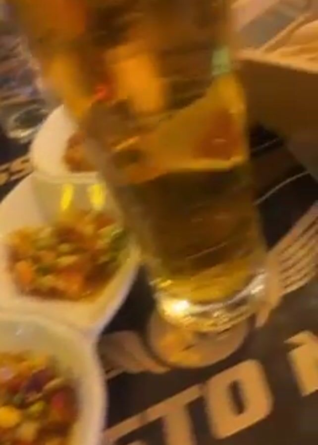 table setting in a restaurant. There are several small white bowls containing various dips or appetizers arranged around a glass of beer with a white head. Beside the beer is a small wooden tray holding pieces of bread. Another glass of water is visible in the background, and there is indistinct conversation in the background. The table has a graphic design on it. The camera moves slightly to show more of the setting.