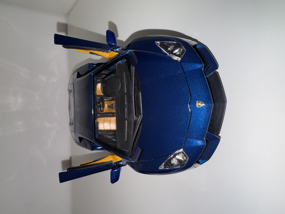 A blue toy Lamborghini with its doors open sits against a white background. The car is a highly detailed model with visible interior, including seats and steering wheel, and exterior, including headlights, Lamborghini logo and rearview mirrors. The interior accents of the doors are yellow. The angle of the image is a bird's eye view. The model shows signs of wear with dust visible around its edges.