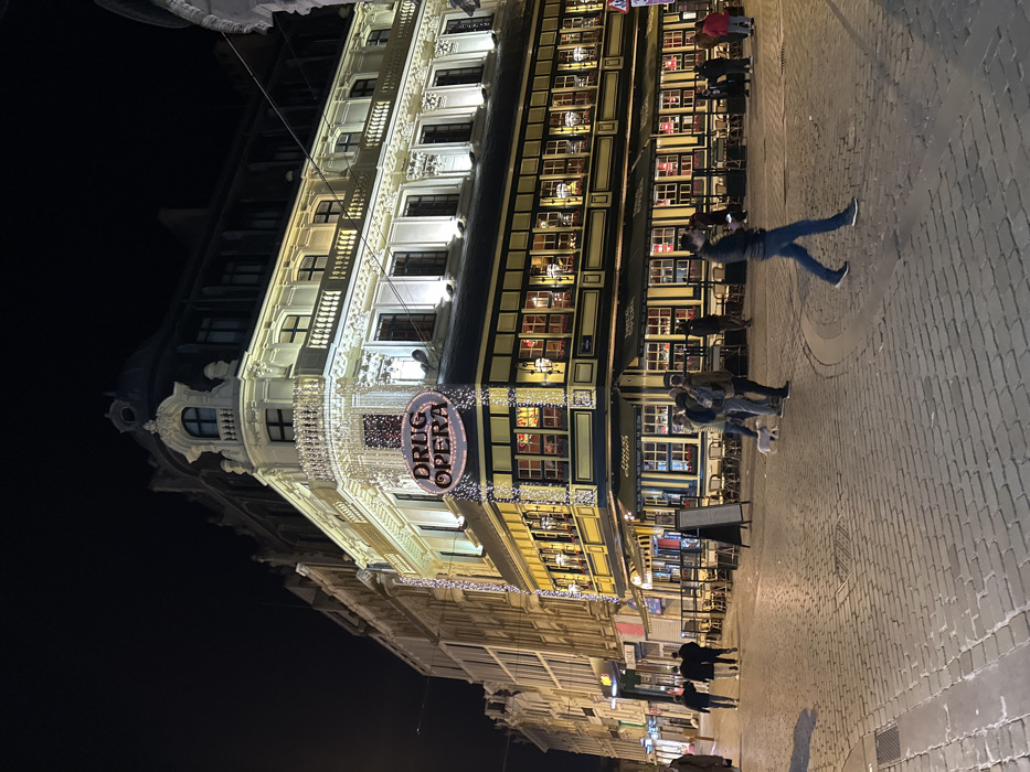 The image depicts a nighttime street scene in Brussels, Belgium, specifically at the corner of Rue Grétry, featuring the "DRUG OPERA" establishment. The central subject is a multi-story corner building, brightly illuminated. Its lower two floors house the "DRUG OPERA," characterized by large glass windows with warm interior lighting, dark green awnings, and a distinctive oval-shaped illuminated sign displaying "DRUG OPERA" in a white serif font, prominently positioned above the ground floor at the corner. The building's facade above the first floor is light-colored, ornate, and features classical architectural details, including multiple windows, balconies with balustrades, and decorative trim. String lights adorn the building's corner, particularly around the "DRUG OPERA" sign and a curved balcony on the second floor. The upper floors are darker, topped by a roof structure with dormer windows. Adjacent buildings extend down the street to the left, also illuminated, indicating a commercial area. The street and sidewalk are paved with cobblestones. An outdoor seating area with numerous unoccupied tables and chairs extends from the "DRUG OPERA" onto the cobblestones. Several A-frame sidewalk signs are visible near the seating. Multiple individuals are present. In the mid-ground, a man walks from right to left, wearing dark clothing and looking down at a mobile phone held in his right hand. To his right, near the outdoor seating, a group of approximately five individuals stands clustered; one person is bent over. A small, white, short-haired dog on a leash stands near this group. Further down the street on the left, a group of three people walks away from the viewer. Other indistinct figures are visible further in the background and through the windows of the establishment. The sky is dark, indicating night, and artificial lighting is the primary light source.