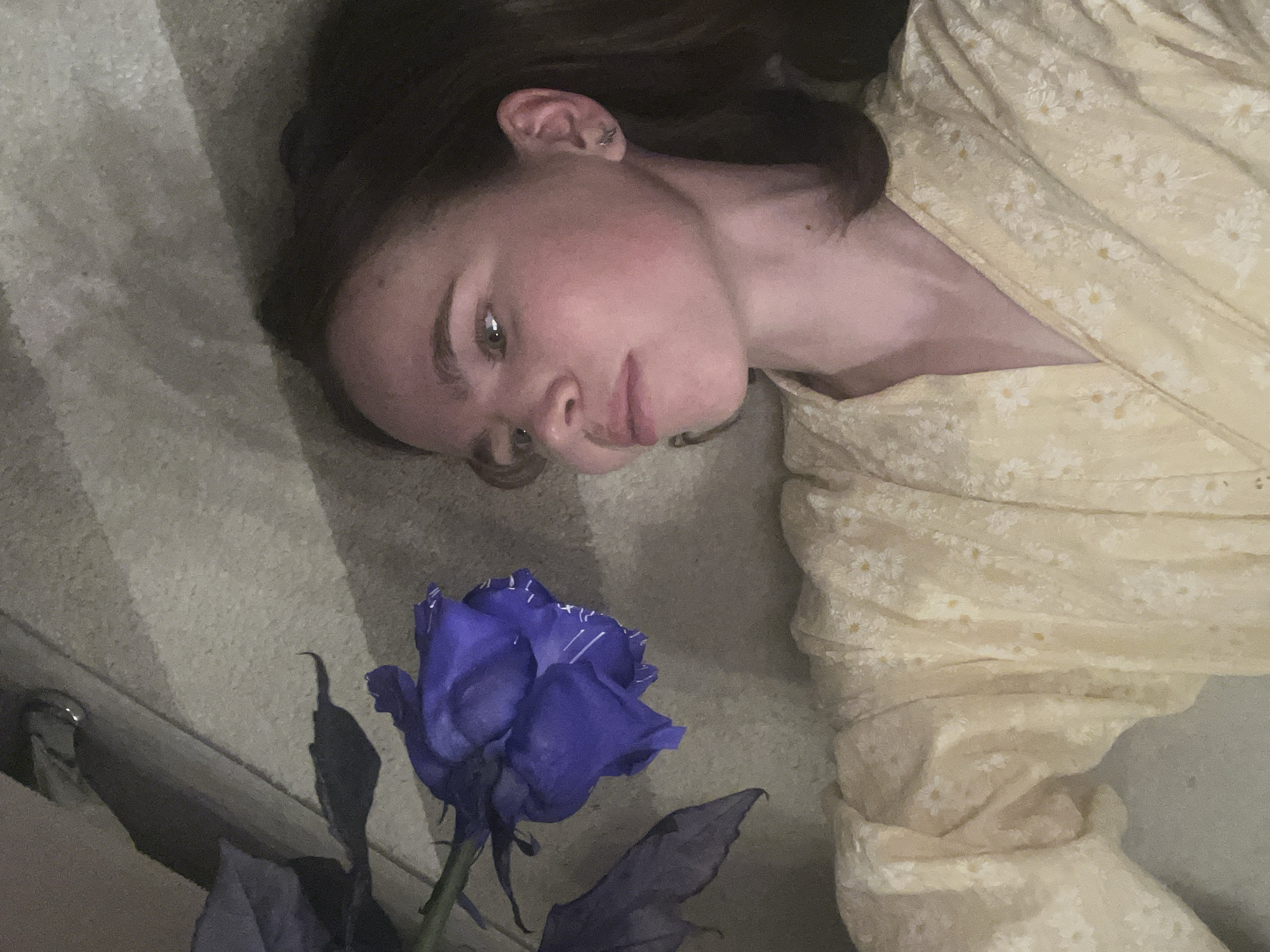 A young woman with brown hair lies on a tan carpet next to a blue rose