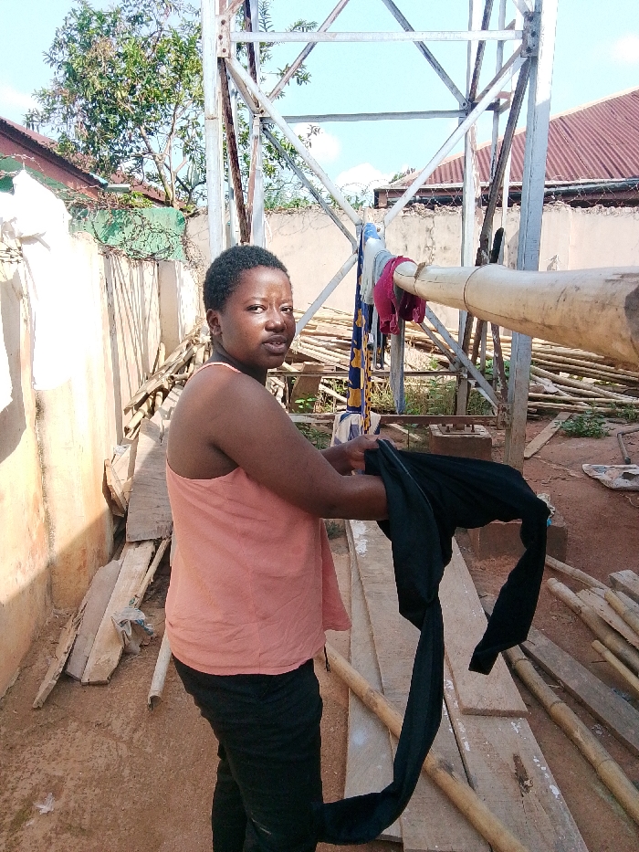 An outdoor scene in Agbor, Nigeria, depicts an adult female standing slightly left of center, looking directly at the camera. She wears a light peach-colored sleeveless top and dark trousers. In her hands, she holds a dark fabric garment, appearing to be in the process of handling laundry. Behind her, a large galvanized metal truss structure, possibly a tower, is visible on the right. Several items of clothing, including red, blue, and patterned fabrics, are draped over a horizontal light-colored wooden pole serving as a clothesline, which is attached to or near the truss. To the left, a light-colored concrete or masonry wall topped with barbed wire extends horizontally. The ground is reddish-brown soil, cluttered with numerous wooden planks and bamboo poles. In the background, beyond the immediate structures, parts of buildings with reddish corrugated roofs and green foliage are discernible under a bright sky.
