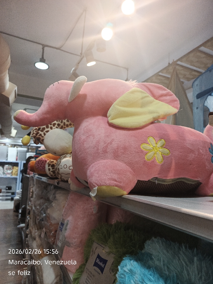 The image depicts an indoor retail environment in Maracaibo, Venezuela, on 2026/02/26 at 15:56. The primary subject is a large, plush pink elephant with yellow ears, white tusks, and a yellow-and-white embroidered flower on its side, resting on a light-colored shelf. A brown zippered compartment is visible on the elephant's underside. Behind this, a line of various plush toys, including a giraffe-patterned item and a white spherical one, extends into the background on similar shelving. Below the main shelf, other packaged textile goods, including a green fluffy item labeled "Blanket," are visible. The ceiling features exposed dark-colored conduit and multiple illuminated track lighting fixtures, casting bright light. No individuals are present in the scene.