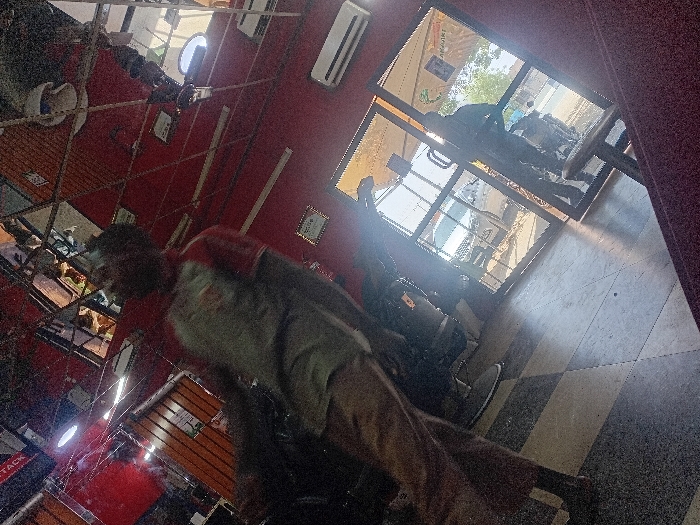 The image depicts an indoor scene in Dorayi, Nigeria, with a partial view of the exterior through a glass entrance. The interior features red painted walls and a geometric, highly reflective ceiling system composed of numerous angled mirror or polished metal panels, reflecting overhead lights and a red sign with "ATTACK" visible. Two white wall-mounted air conditioning units are present on the right wall. The floor is covered with large, alternating light and dark square tiles arranged in a checkered pattern. In the foreground, a person is captured in motion, appearing blurred. This individual wears a light-colored short-sleeved shirt with red accents on the shoulders/sleeves and light brown trousers, with their back partially towards the viewer. Towards the center-right, a glass door with a dark frame serves as the primary exit/entrance. Through the glass door, a silhouetted individual is visible standing outdoors near a parked motorcycle. A white vehicle, possibly an SUV, is also visible parked further down the street. The exterior scene is brightly lit by daylight, with trees visible in the background. A yellow and green sign, partially legible as "KARAKI," is affixed to the exterior side of the glass door. A small, dark, round stool or table is positioned inside near the door. The bottom right corner shows a dark, possibly maroon, upholstered object.