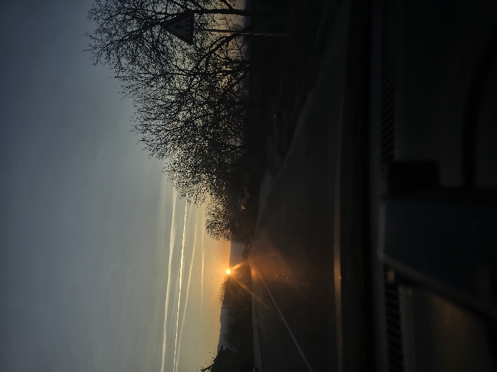 The image depicts a rural road scene in the city of Zvanichevo, Bulgaria, at sunset or sunrise, viewed from inside a vehicle. The sun, a bright orange-yellow orb, is low on the horizon, slightly left of the center, casting a strong glare across the asphalt road. The sky transitions from a dark blue at the zenith to an orange-yellow near the horizon, featuring two prominent horizontal white contrails in the upper-middle left. A line of bare-branched deciduous trees, silhouetted, borders the right side of the road. Partially visible behind these trees on the right is a triangular road sign indicating a pedestrian crossing. The road, marked with a white solid line on its left edge, curves gently to the left and recedes into the distance. Distant hills are faintly silhouetted against the horizon. The dark dashboard of a vehicle occupies the bottom quarter of the frame. No individuals or active interactions are visible.