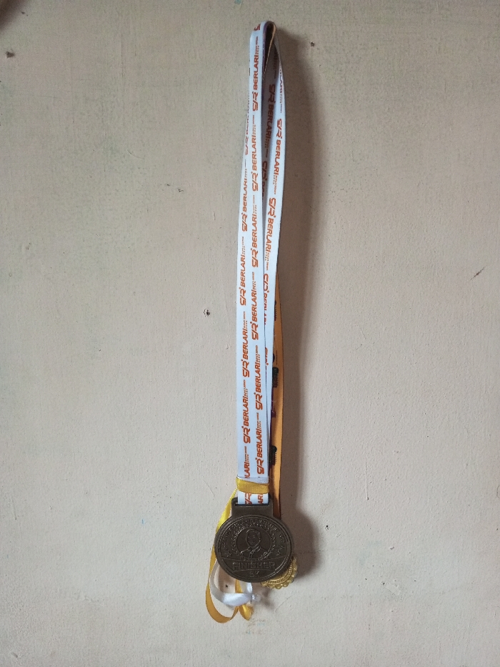 A medal hangs against a textured, light-colored wall. The medal, metallic brown with gold accents, displays a portrait and the word "FINISHER." The medal's ribbon is primarily white, printed with the repeating text "BERLARI," accompanied by "SR." Yellow and gold ribbons are visible beneath the medal. The wall features subtle imperfections and discolorations.