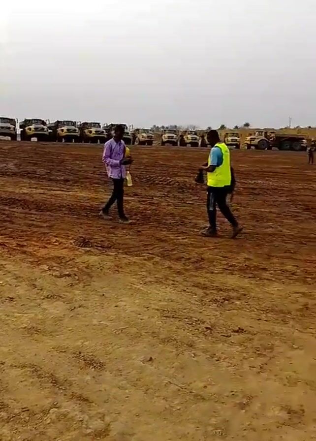 construction or mining site on an overcast day. A line of large yellow dump trucks are parked in the background. In the foreground, the ground is dirt and appears to have been recently worked. Several people wearing casual clothes or safety vests are visible, some walking, some standing together. A tall communication tower is visible in the distance, as well as some temporary buildings. The video quality is somewhat poor.